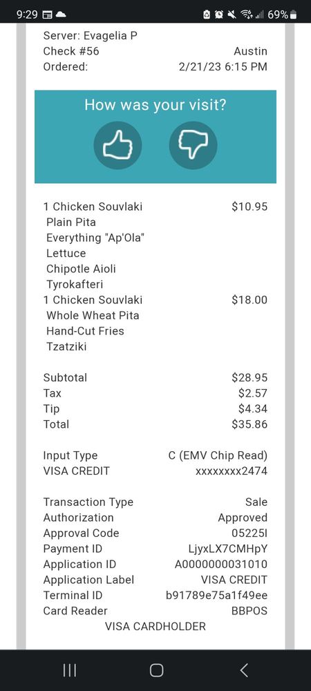 “ This location was neat and clean. Upon entry into the establishment you order at the counter and you your food is brought to the table, The staff was friendly and appeared to know the menu well. The spinach pie was delicious and served at the perfect temperature. The souvlaki club was very large and tasted delicious, It was big enough to split between two people. The French fries served with the club were served hot and delicious with paprika and white cheese. We will be back. ”